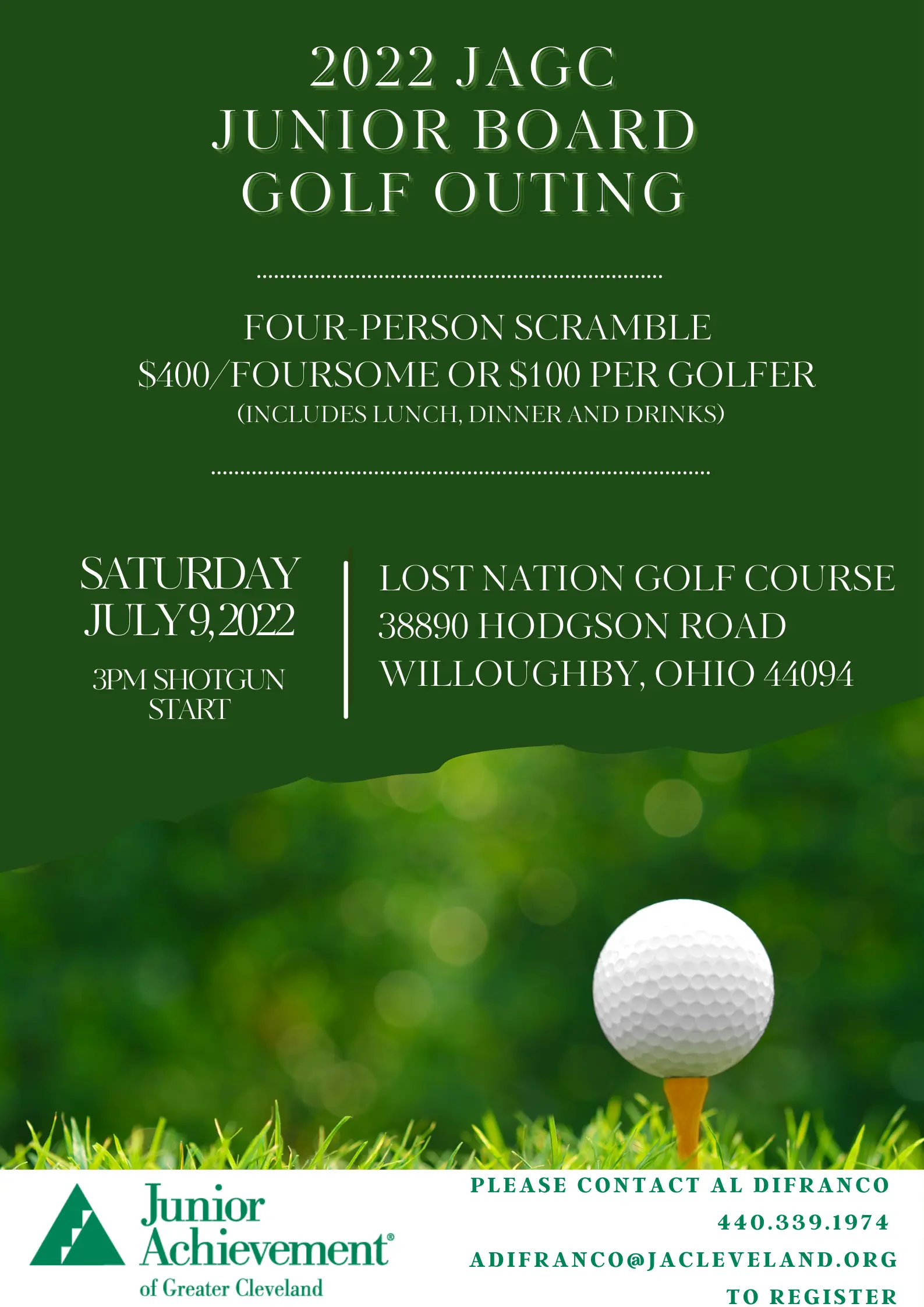 Join us for our annual four-person scramble that includes 18 holes and riding cart, lunch, dinner, and drinks! This event raises important dollars for JA programs while offering a great networking opportunity! The format is a four-person scramble with a 3pm shotgun start time. Registration is $400 per foursome, $100 per golfer. Sponsorship opportunities are available as well!